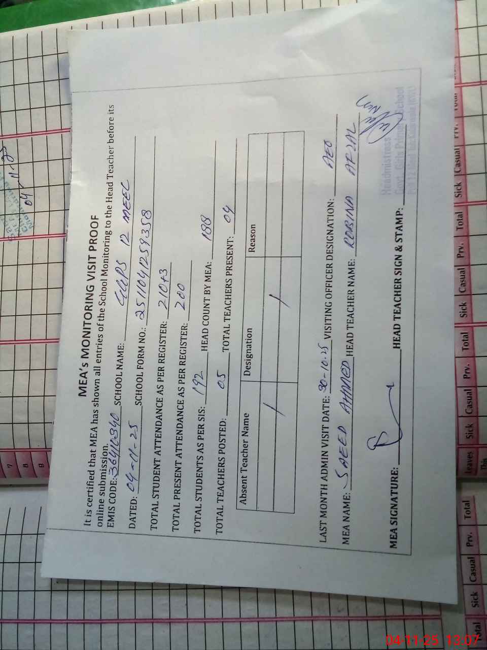 | Attendance Register | Head Teacher | MEA with School | Visit Proof |