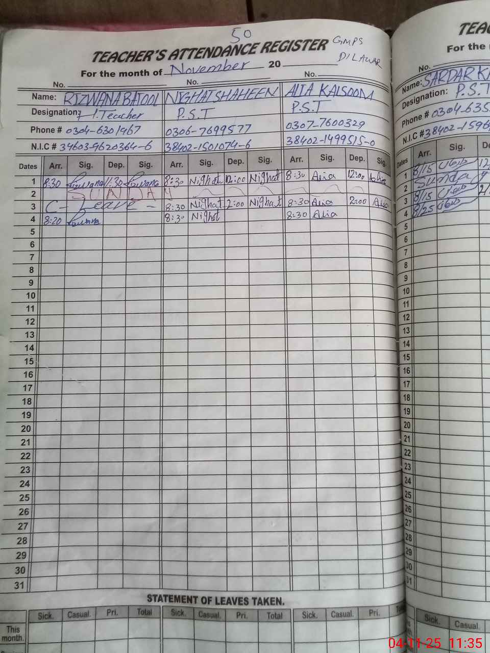 | CNIC | Full Name | Designation | R/C | Absence During Last Calender Month |