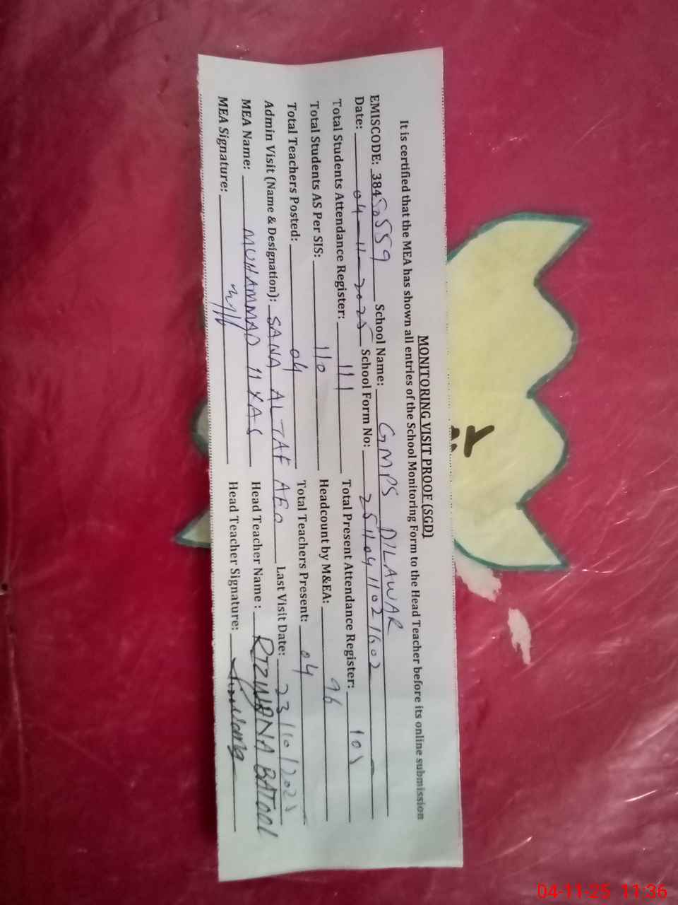 | Attendance Register | Head Teacher | MEA with School | Visit Proof |