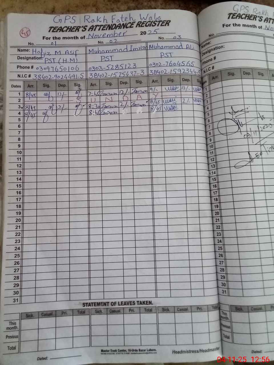 | CNIC | Full Name | Designation | R/C | Absence During Last Calender Month |