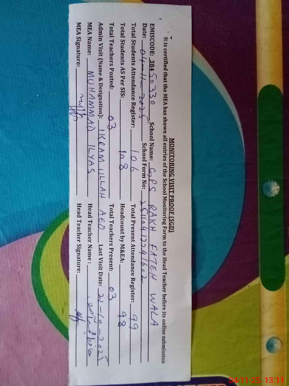 | Attendance Register | Head Teacher | MEA with School | Visit Proof |