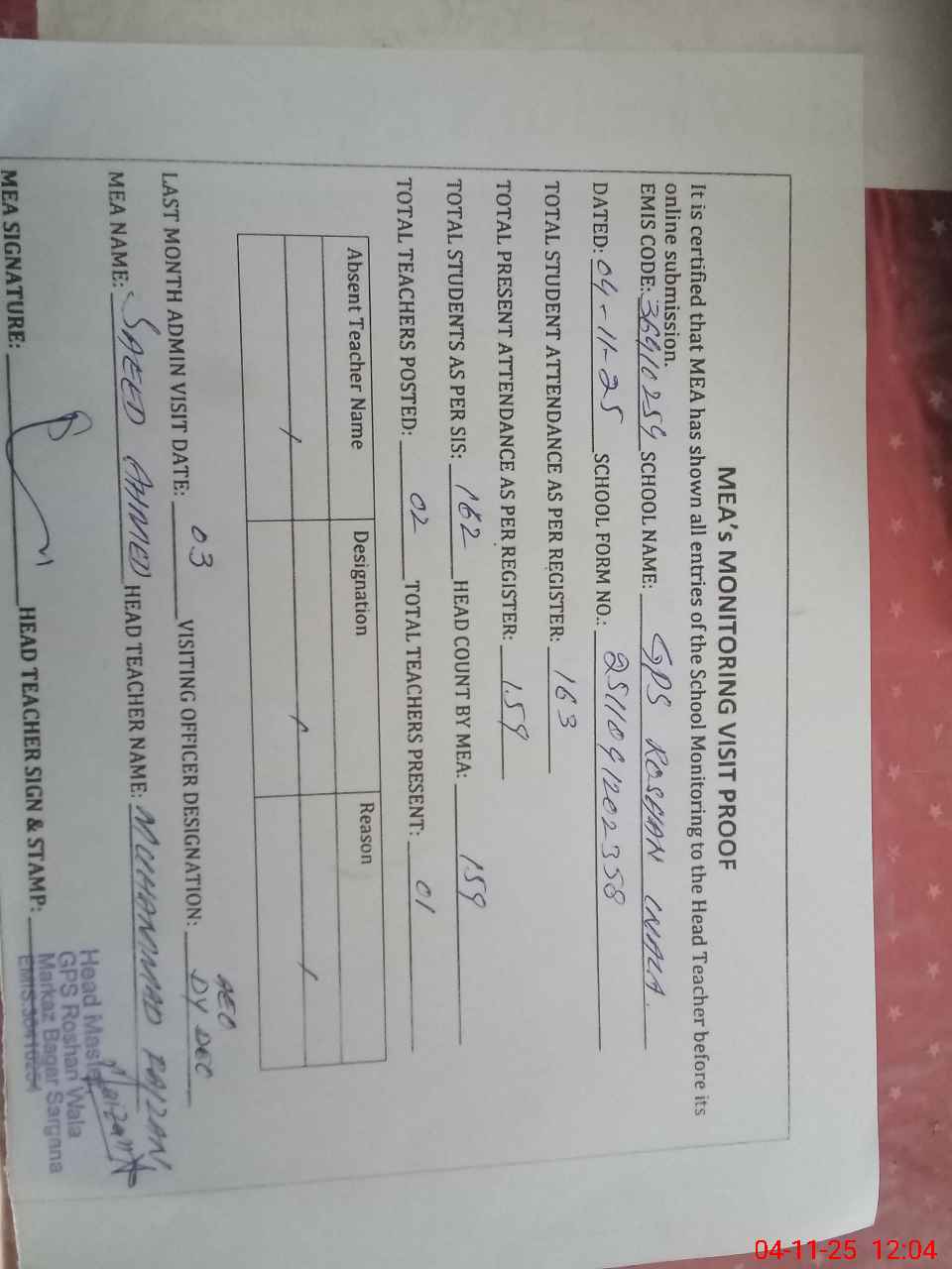 | Attendance Register | Head Teacher | MEA with School | Visit Proof |