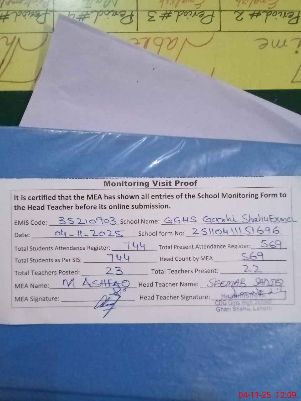 | Attendance Register | Head Teacher | MEA with School | Visit Proof |