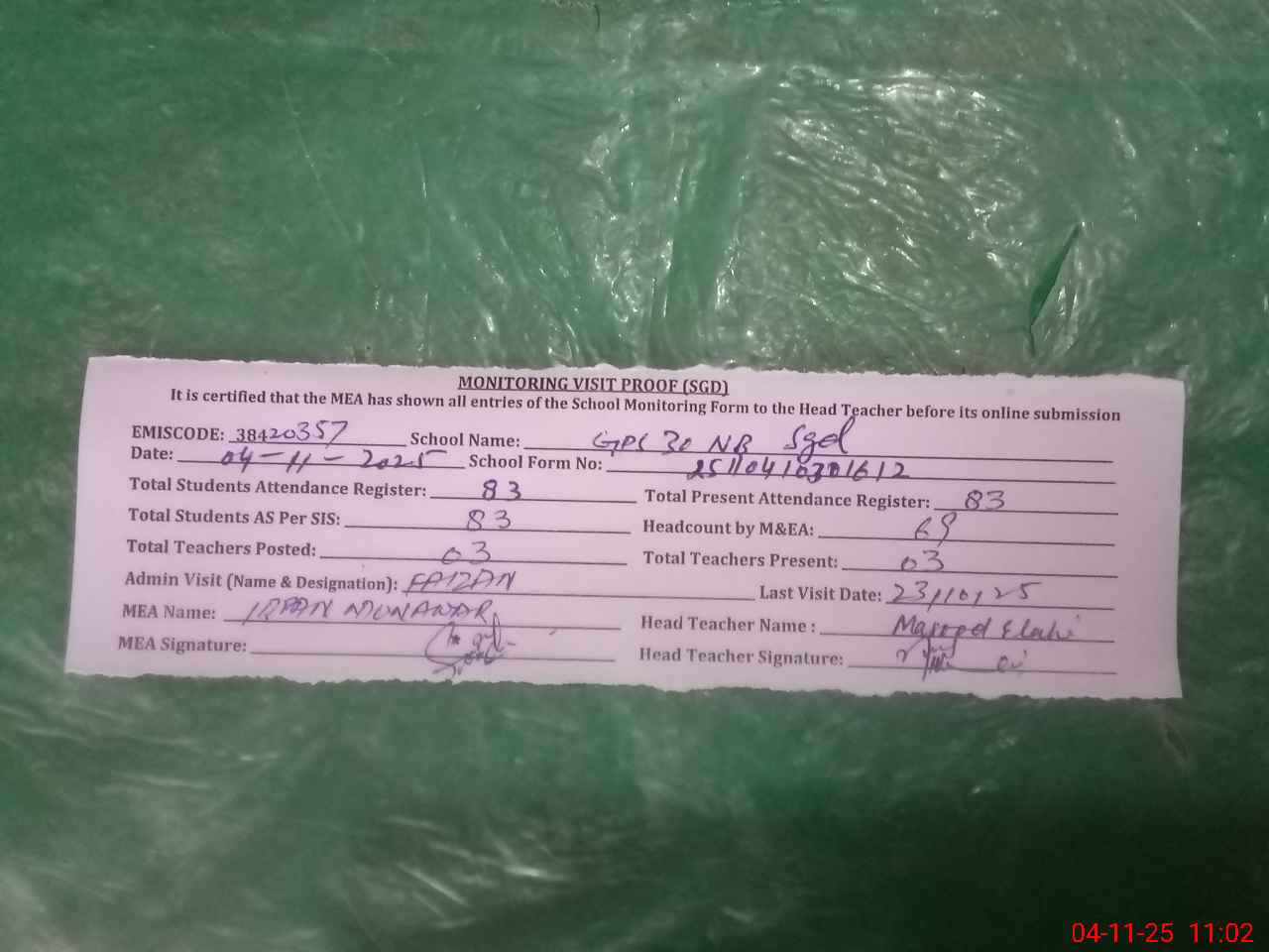 | Attendance Register | Head Teacher | MEA with School | Visit Proof |