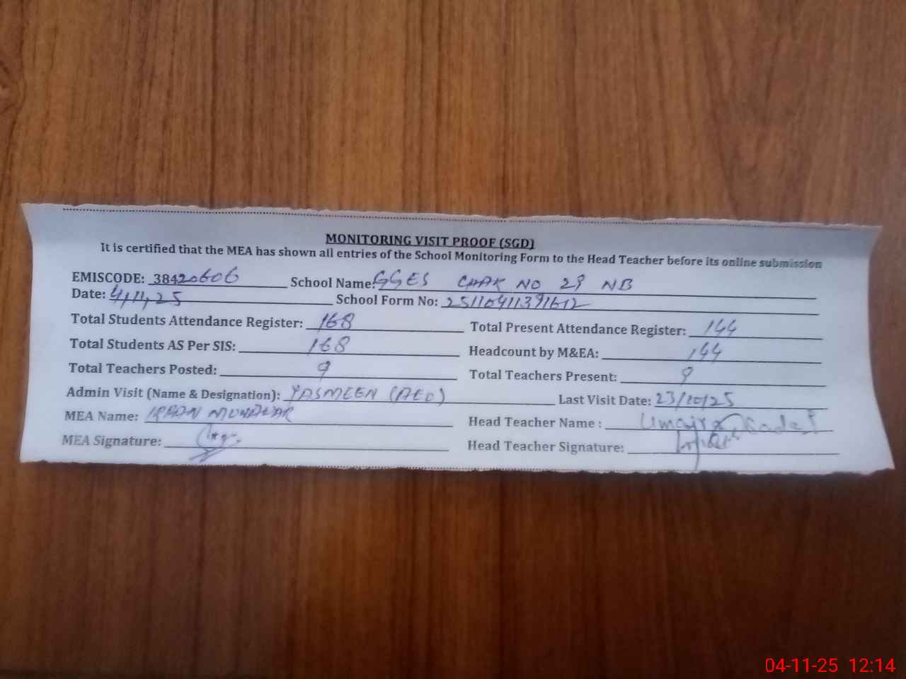 | Attendance Register | Head Teacher | MEA with School | Visit Proof |