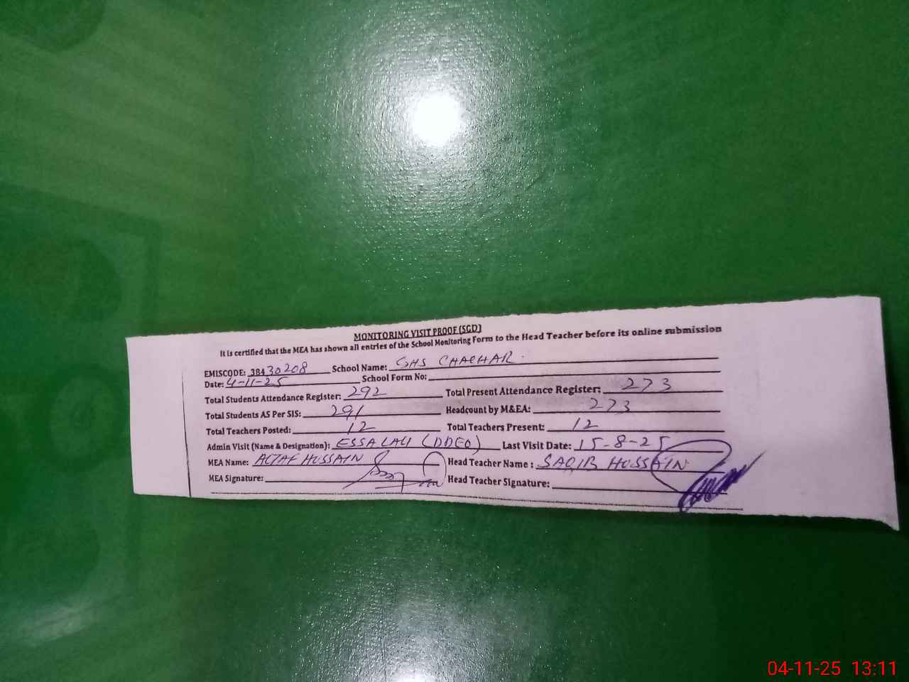 | Attendance Register | Head Teacher | MEA with School | Visit Proof |