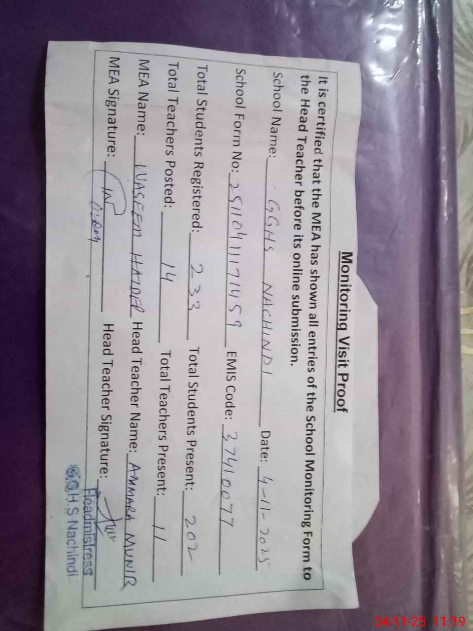 | Attendance Register | Head Teacher | MEA with School | Visit Proof |
