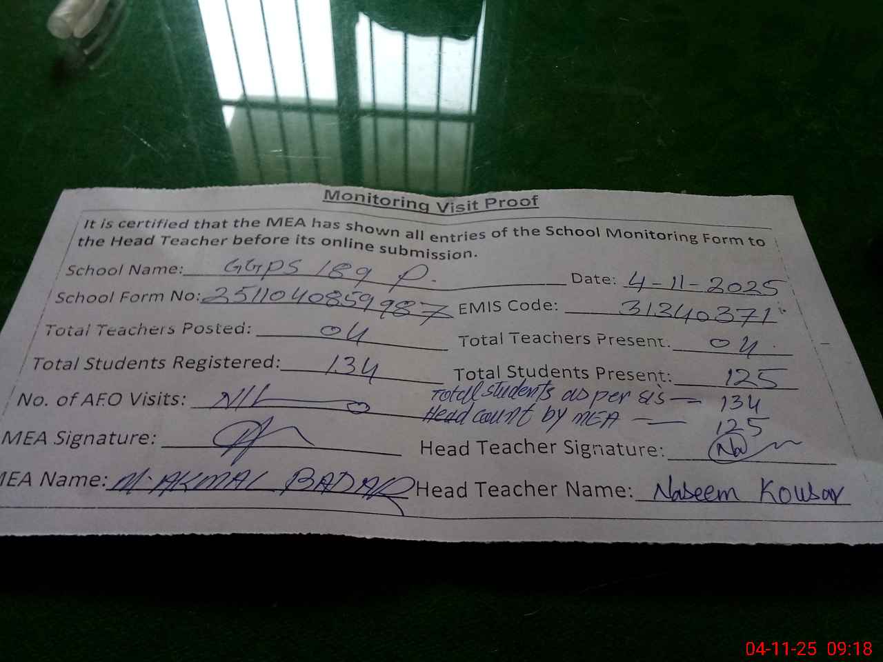 | Attendance Register | Head Teacher | MEA with School | Visit Proof |