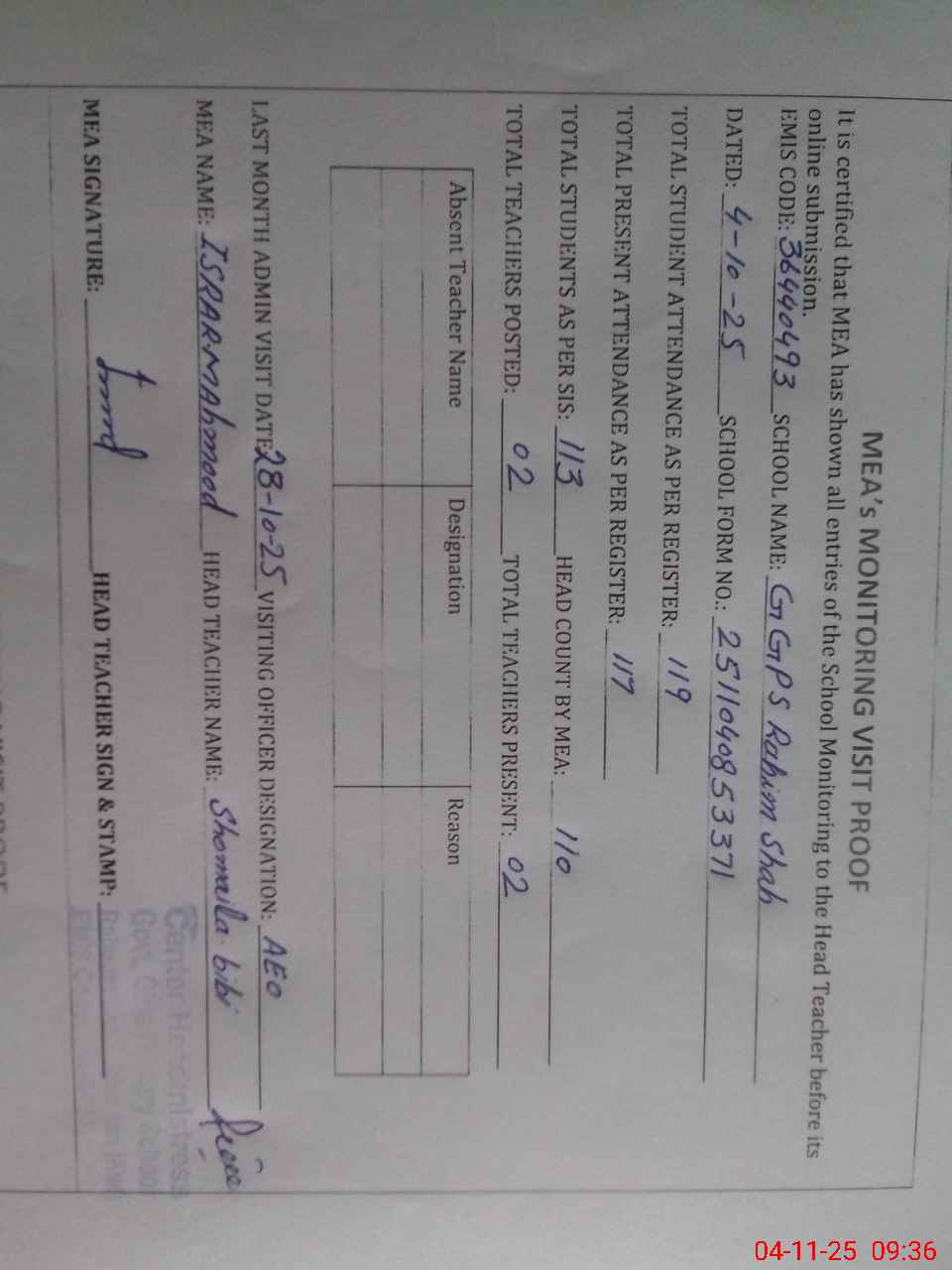 | Attendance Register | Head Teacher | MEA with School | Visit Proof |