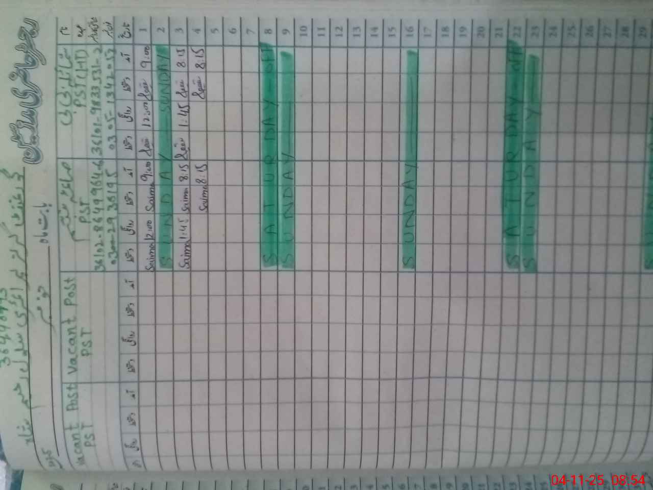 | CNIC | Full Name | Designation | R/C | Absence During Last Calender Month |