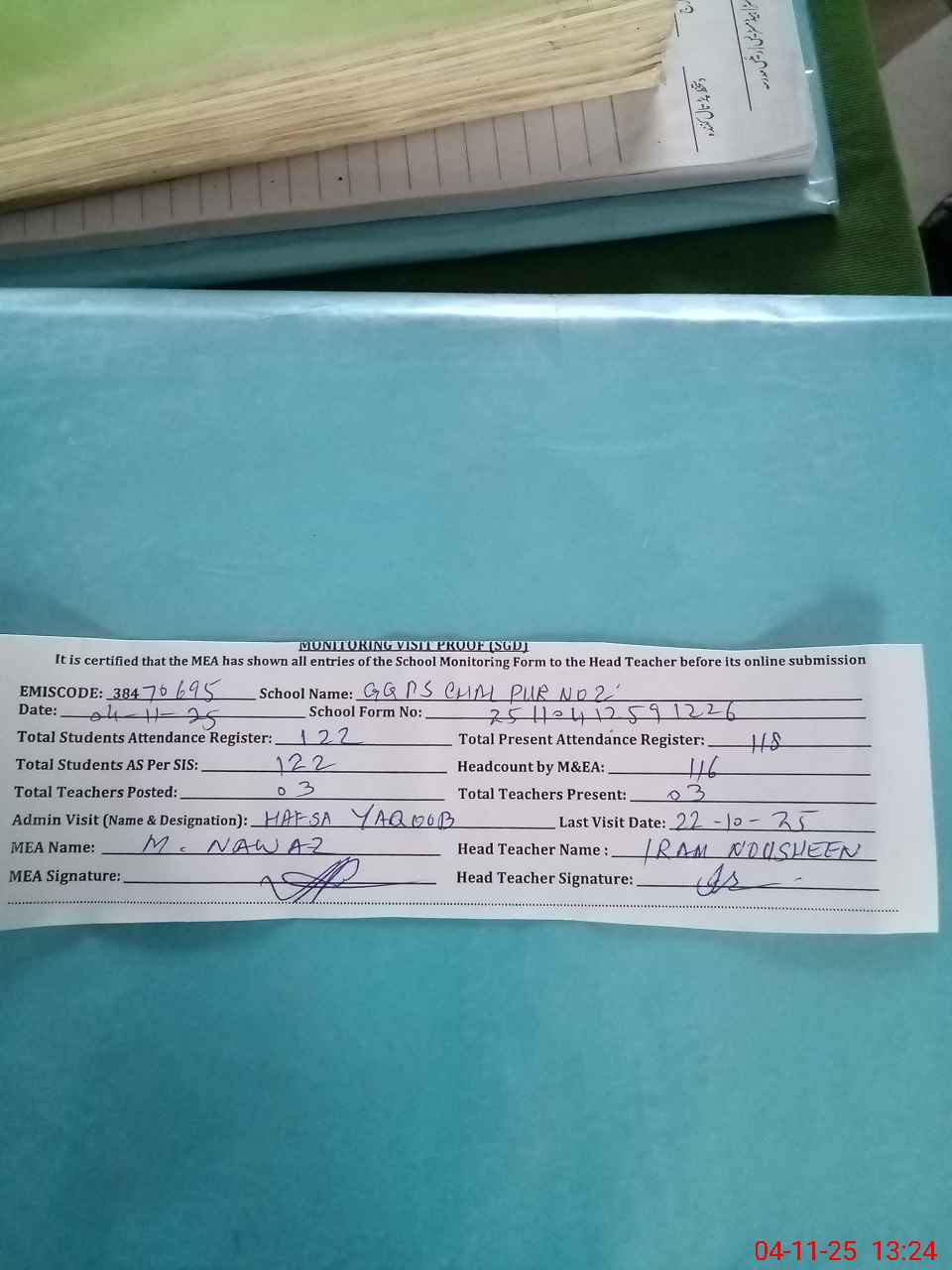 | Attendance Register | Head Teacher | MEA with School | Visit Proof |