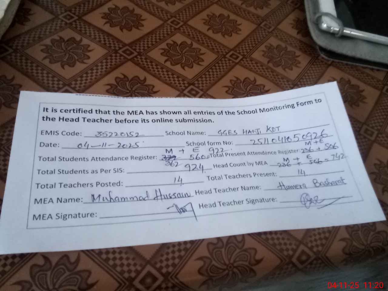 | Remarks (Use Separate Page if Required): 1 AEO visit last month 6th October 2025 and 10th October 2025 2 22 students difference roznamcha and head count morning shift only | |||||