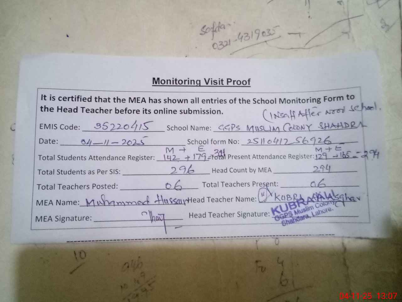 | Attendance Register | Head Teacher | MEA with School | Visit Proof |