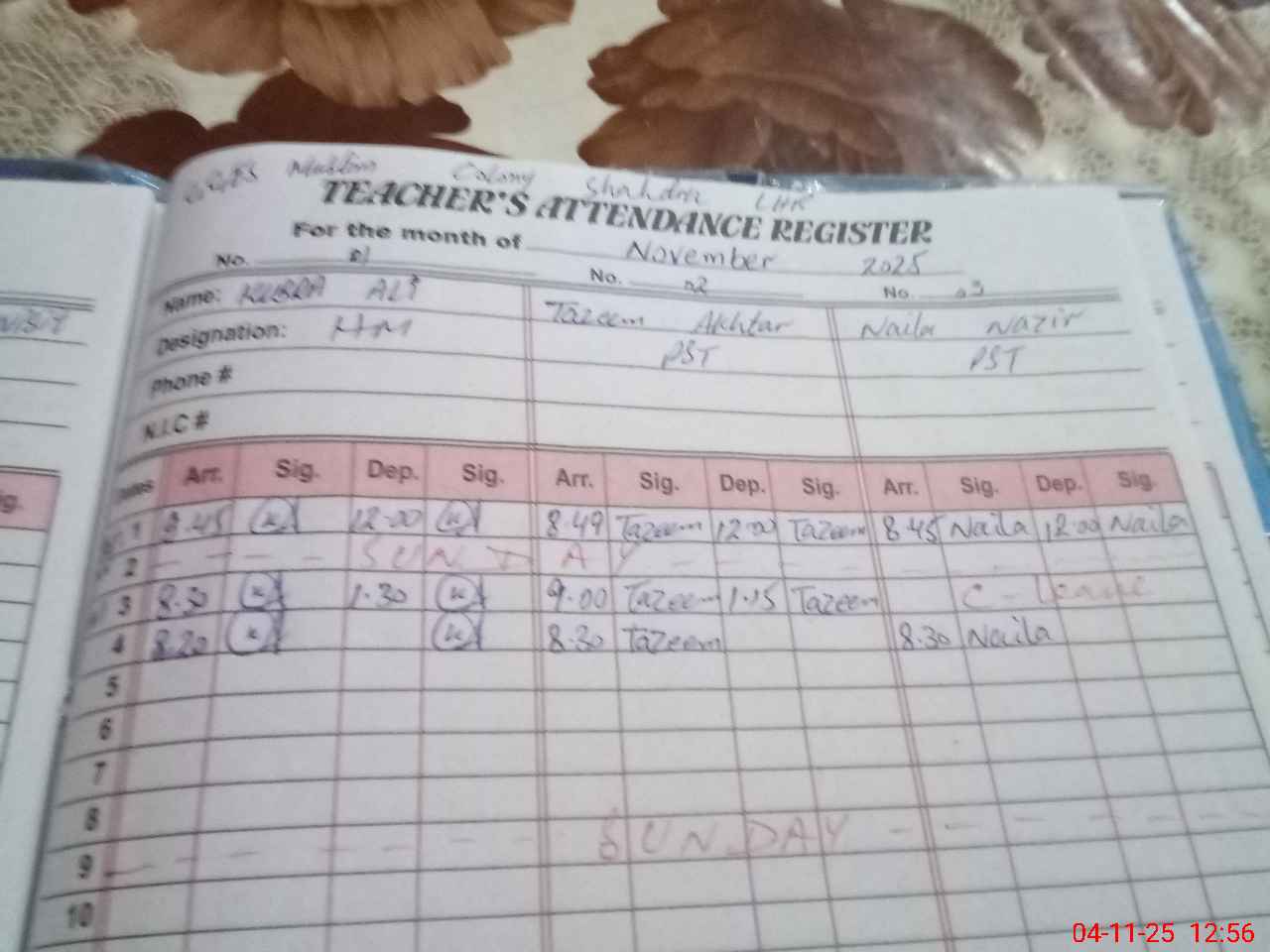 | Remarks (Use Separate Page if Required): 1 Class 8th set A 10 books not received 2 AEO visit last month dated 6th October 2025 and 10th October 2025 3 School building under construction after demolishing and works in progress School shifted in rented building 4 Double shift school only morning shift students head counted data same as per roznamcha and head counted 5 Insaff After noon school | |||||