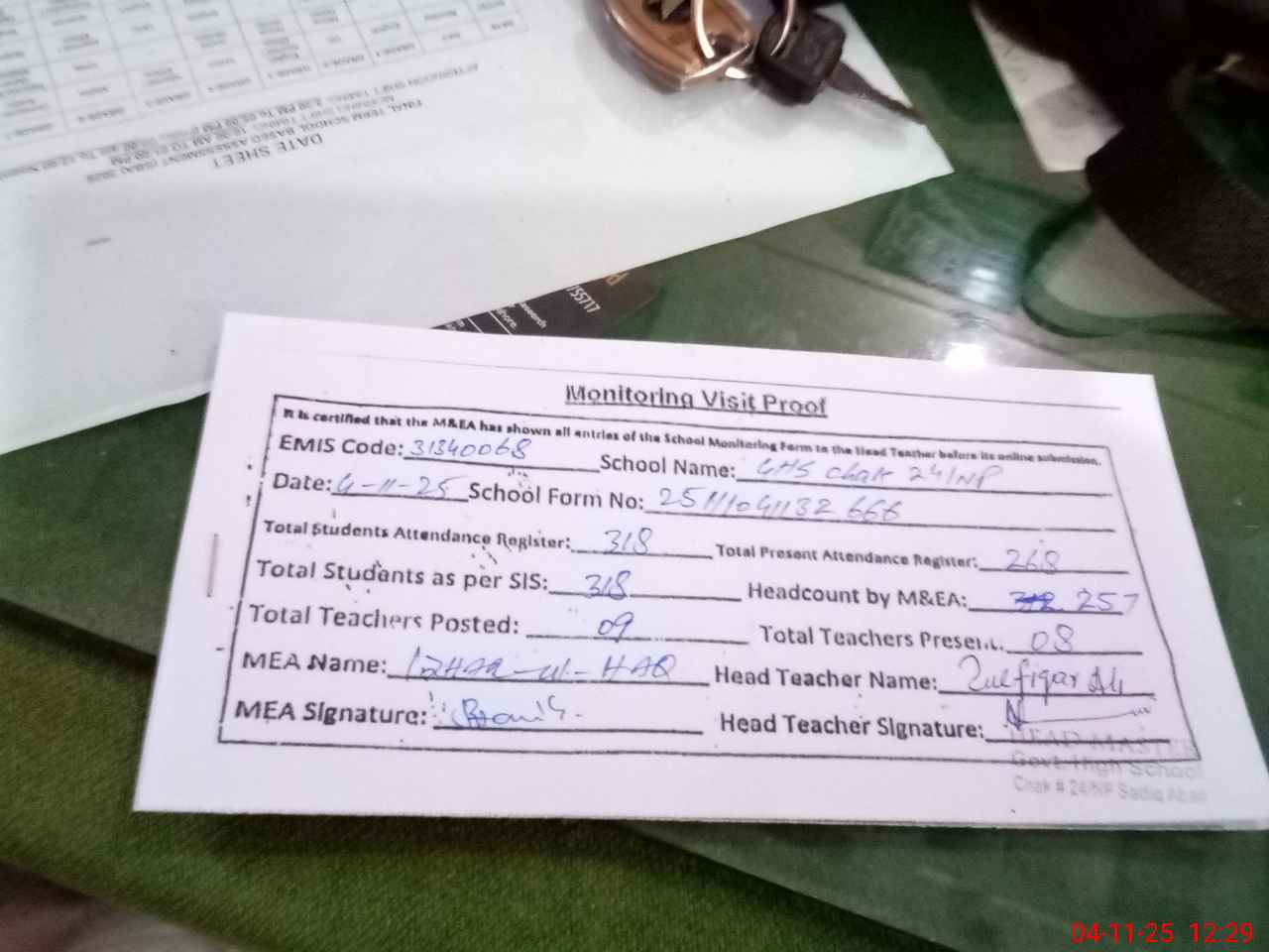 | Attendance Register | Head Teacher | MEA with School | Visit Proof |