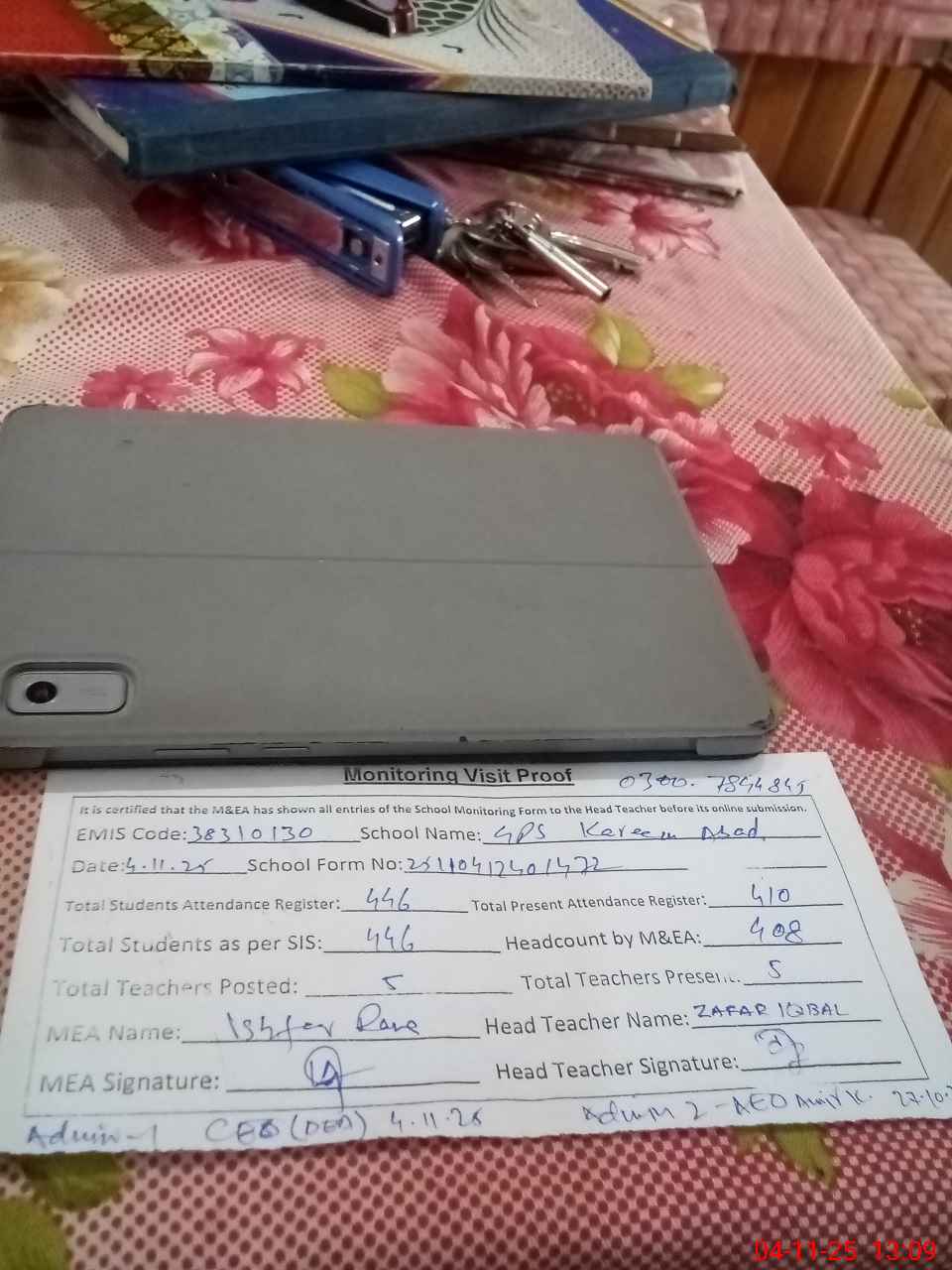 | Attendance Register | Head Teacher | MEA with School | Visit Proof |
