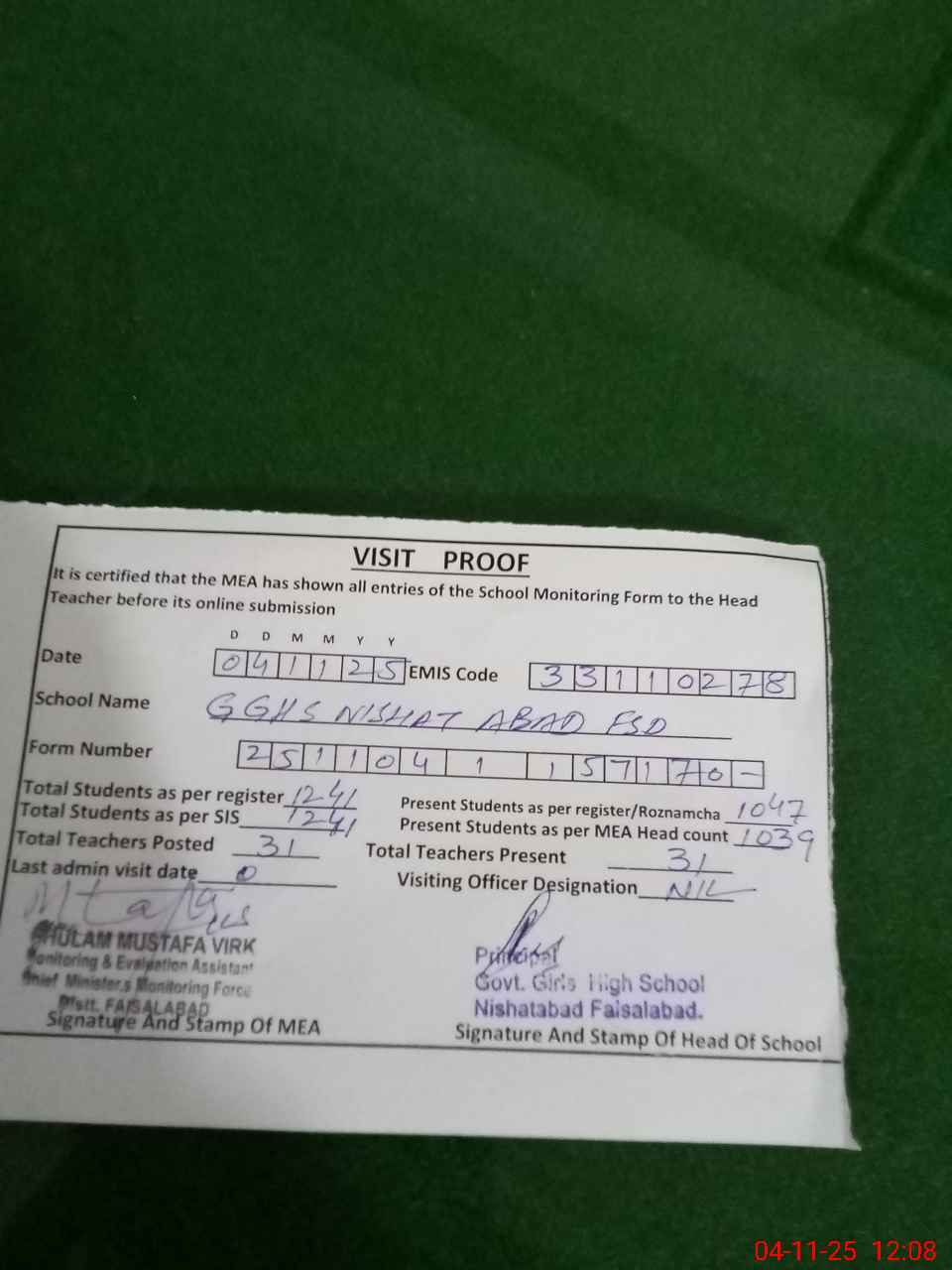 | Attendance Register | Head Teacher | MEA with School | Visit Proof |
