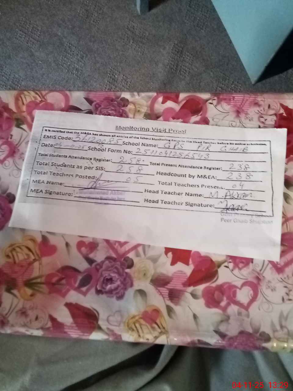 | Attendance Register | Head Teacher | MEA with School | Visit Proof |