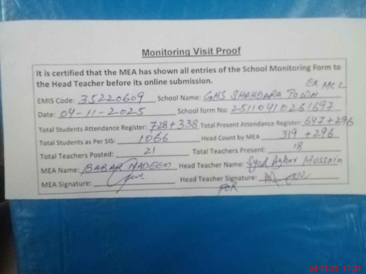 | Attendance Register | Head Teacher | MEA with School | Visit Proof |