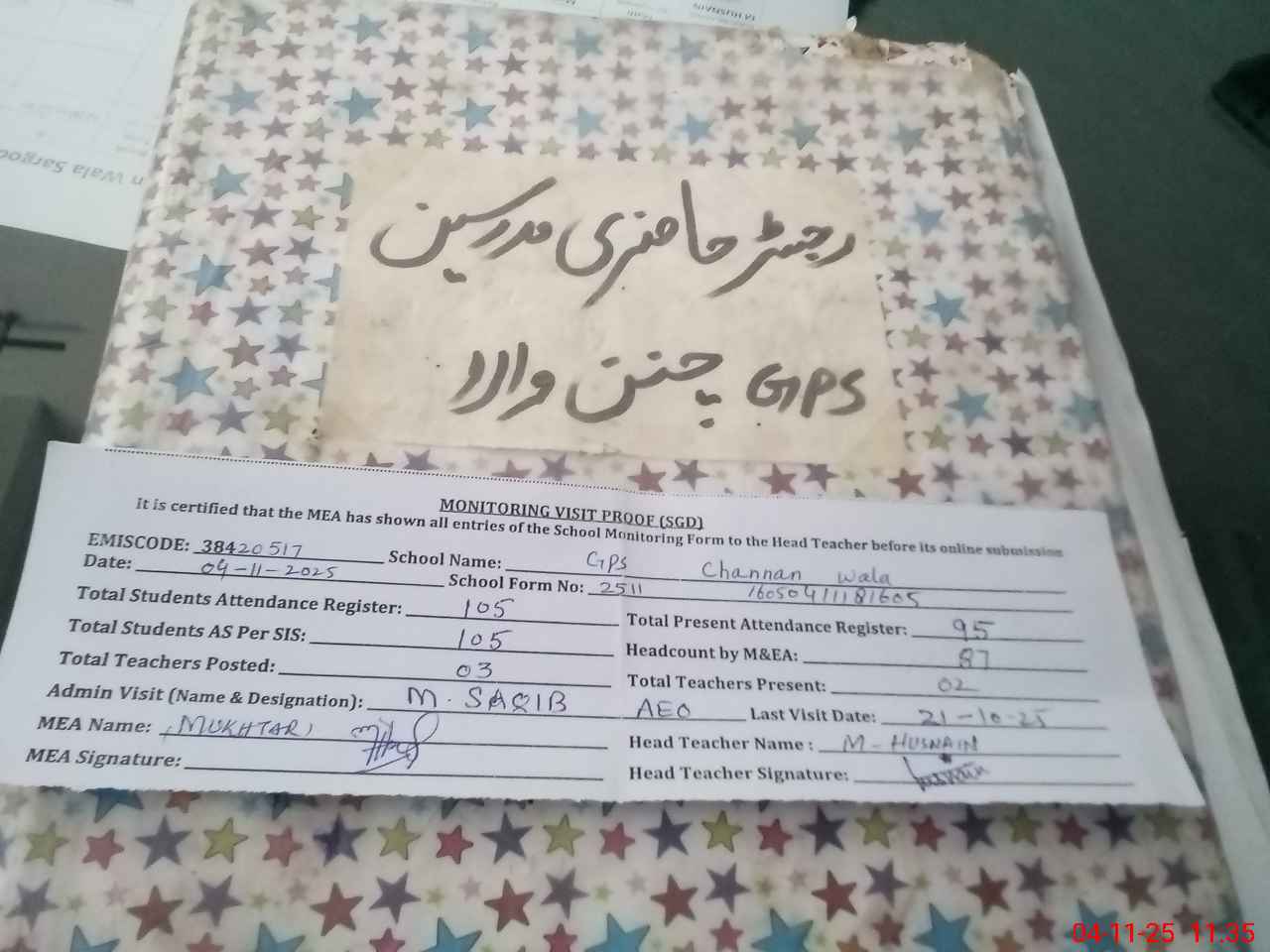 | Attendance Register | Head Teacher | MEA with School | Visit Proof |