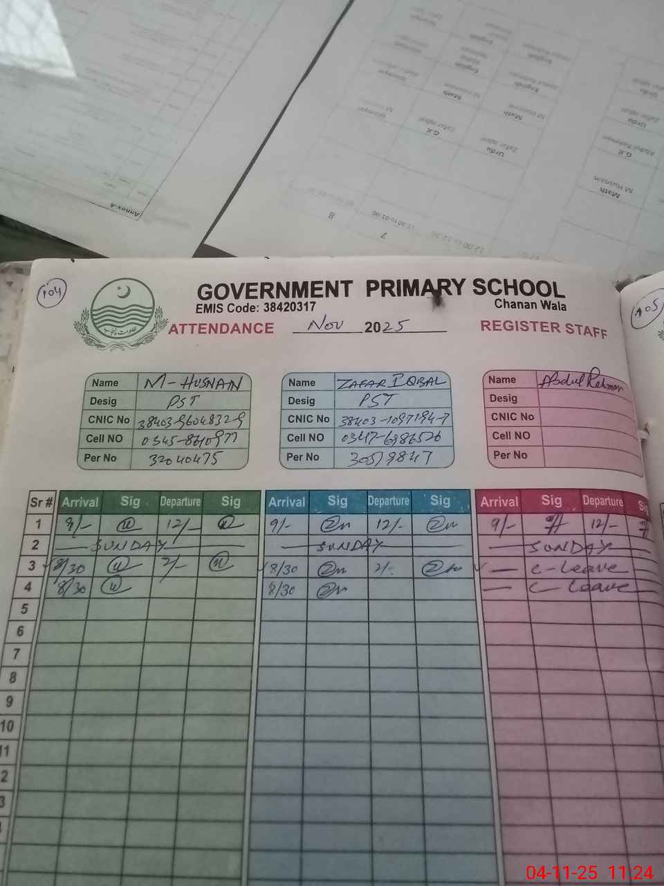 | CNIC | Full Name | Designation | R/C | Absence During Last Calender Month |