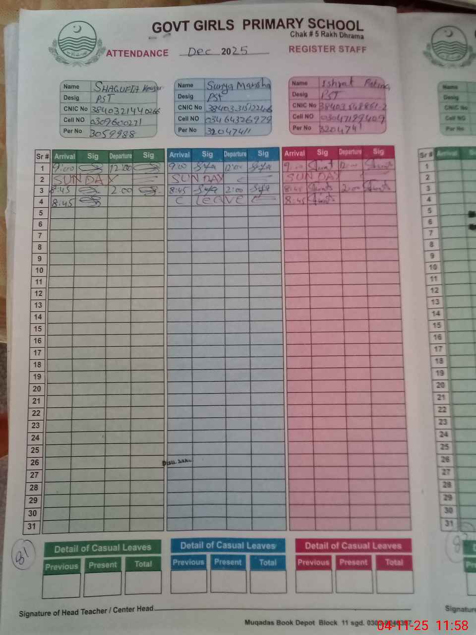 | CNIC | Full Name | Designation | R/C | Absence During Last Calender Month |