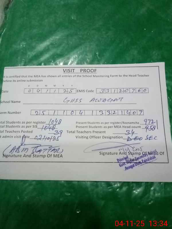 | Attendance Register | Head Teacher | MEA with School | Visit Proof |