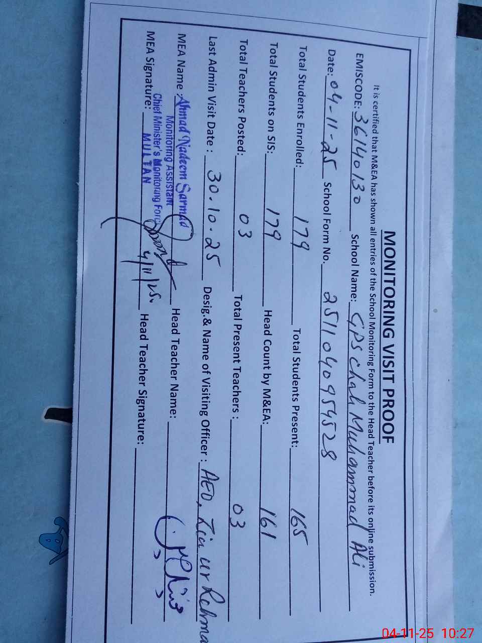 | EMIS Code: 36140130 | Name of School: GPS CHAH MUHAMMAD ALI WALA | |||