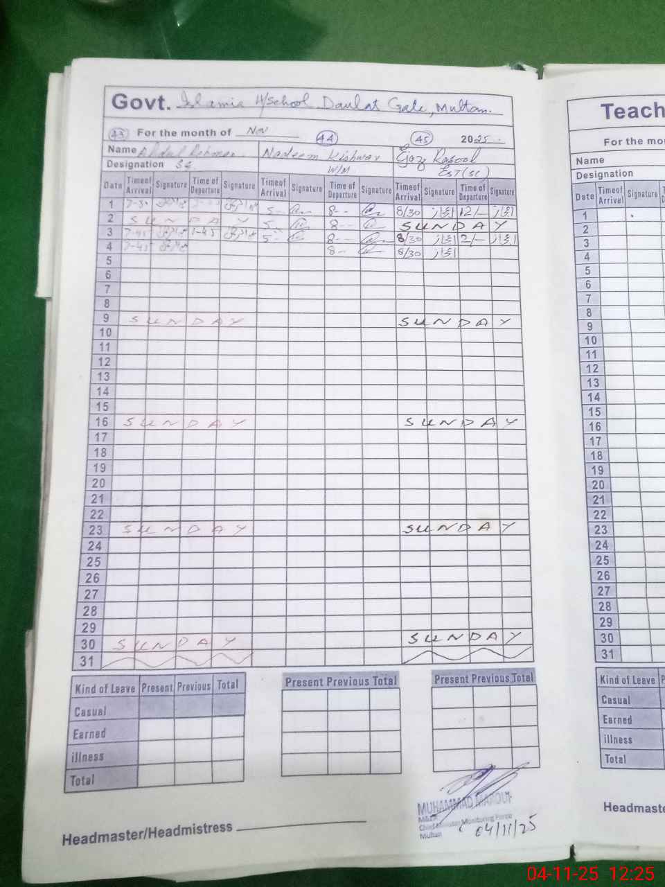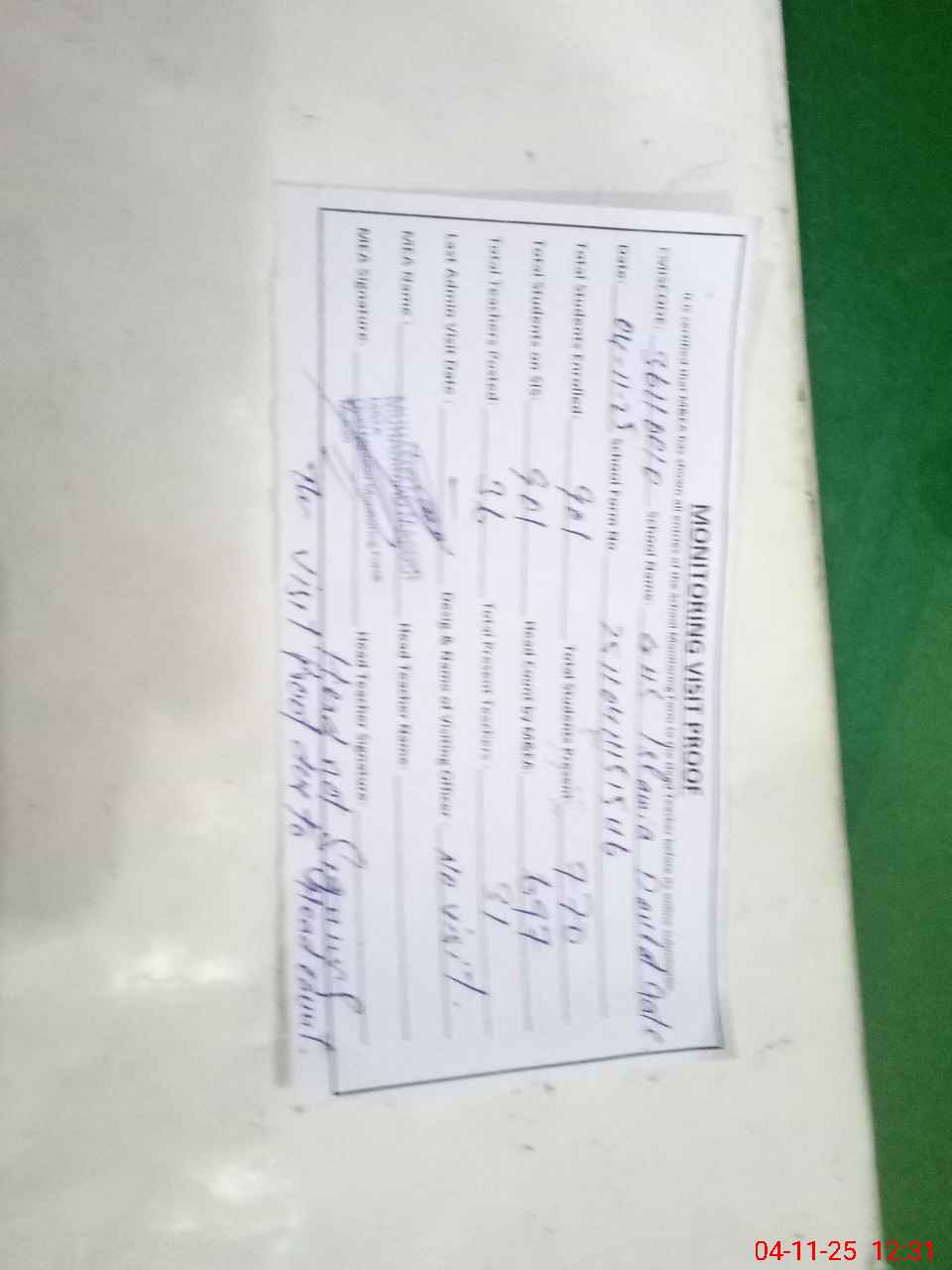 | Remarks (Use Separate Page if Required): School cleaning poor toilets condition worst Class rooms need maintenance and white wash No visit of any authority in the last month School principal has not signed the visit proof due the difference in students enrollment present as per rosenamcha 770 and physically Head count 697 | |||||