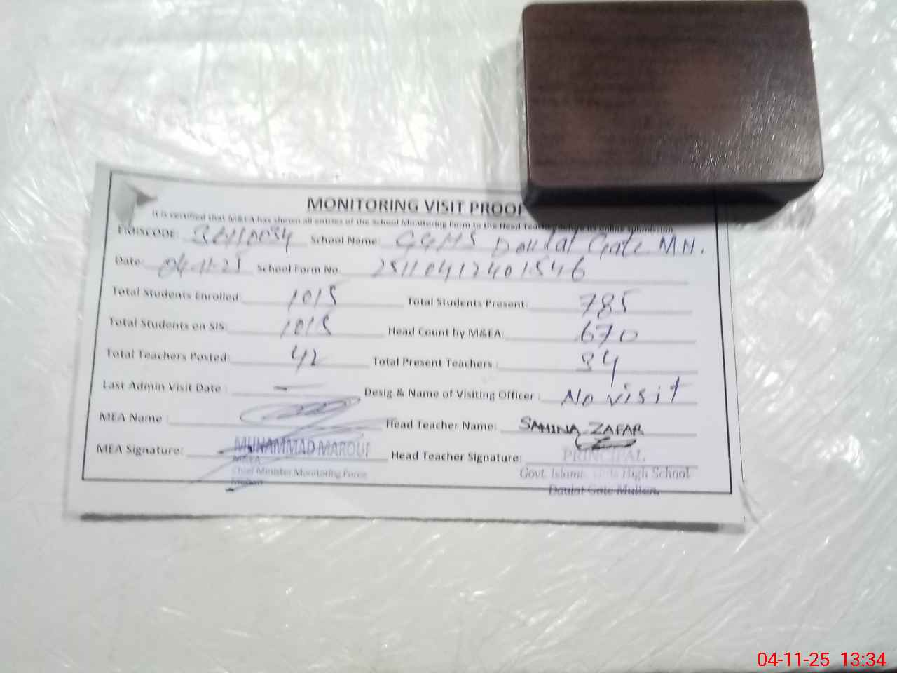 | Attendance Register | Head Teacher | MEA with School | Visit Proof |