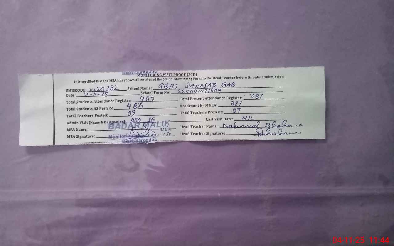 | EMIS Code: 38420232 | Name of School: GGHS SAKESAR BAR | |||