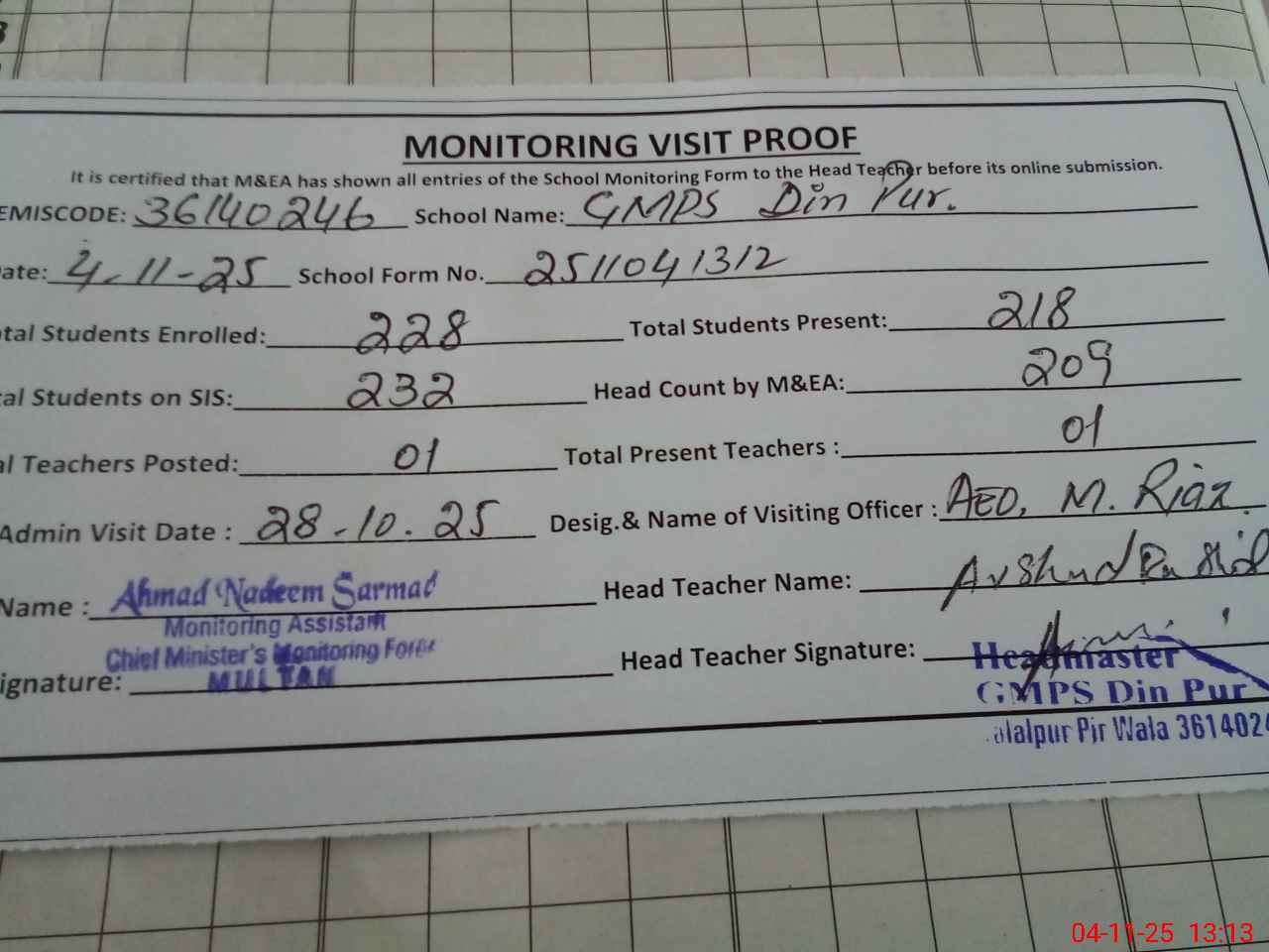 | EMIS Code: 36140246 | Name of School: GMPS DIN PUR JALALPUR PIRWALA | |||