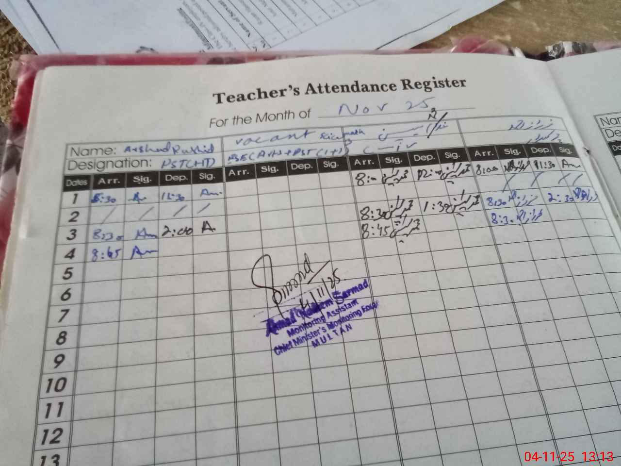 | Name: Ar**** Ra**** Designation: (School Headmaster's/Headmistress's) PST Phone/Cell Number: 03**** |