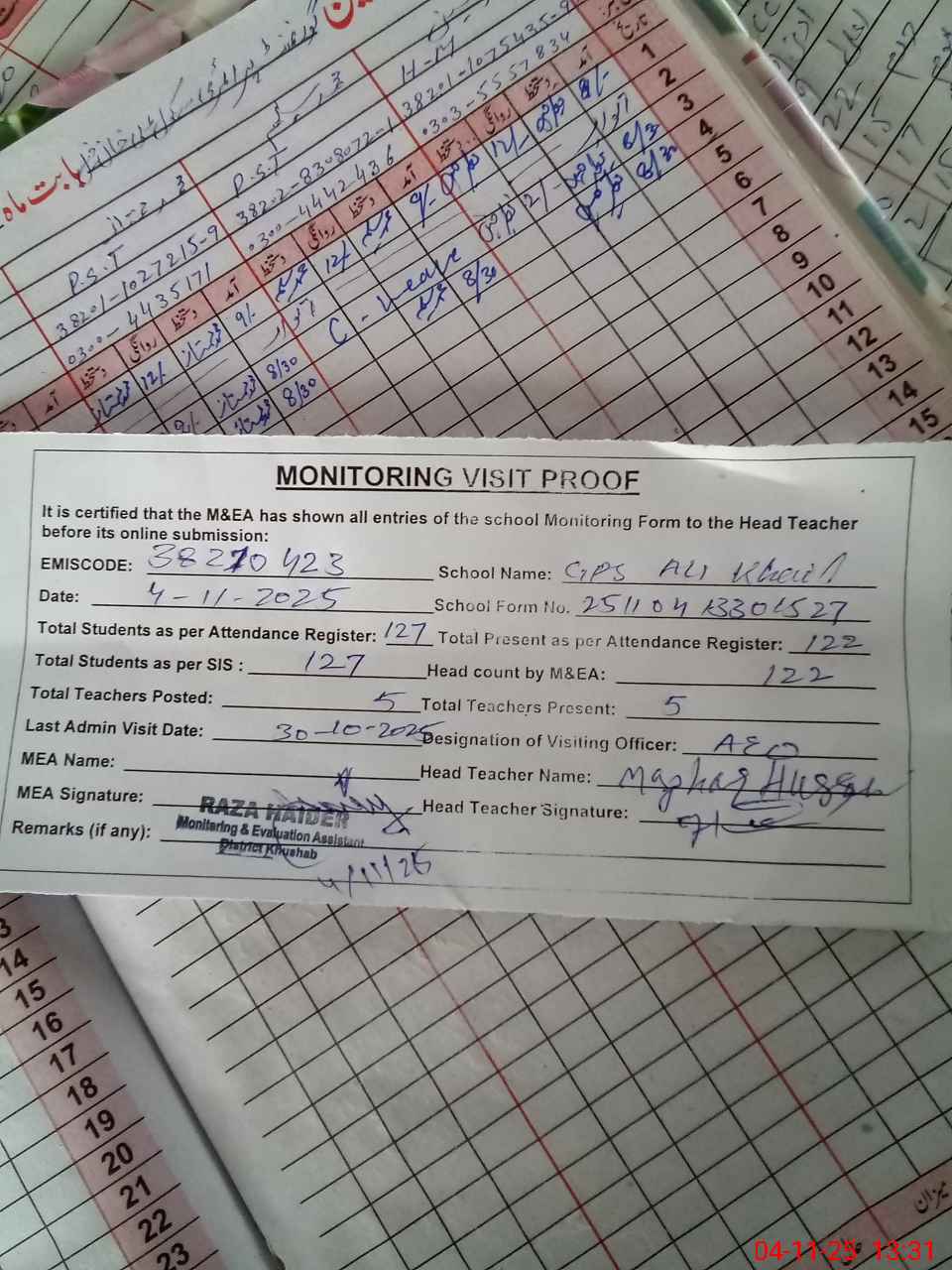 | Attendance Register | Head Teacher | MEA with School | Visit Proof |