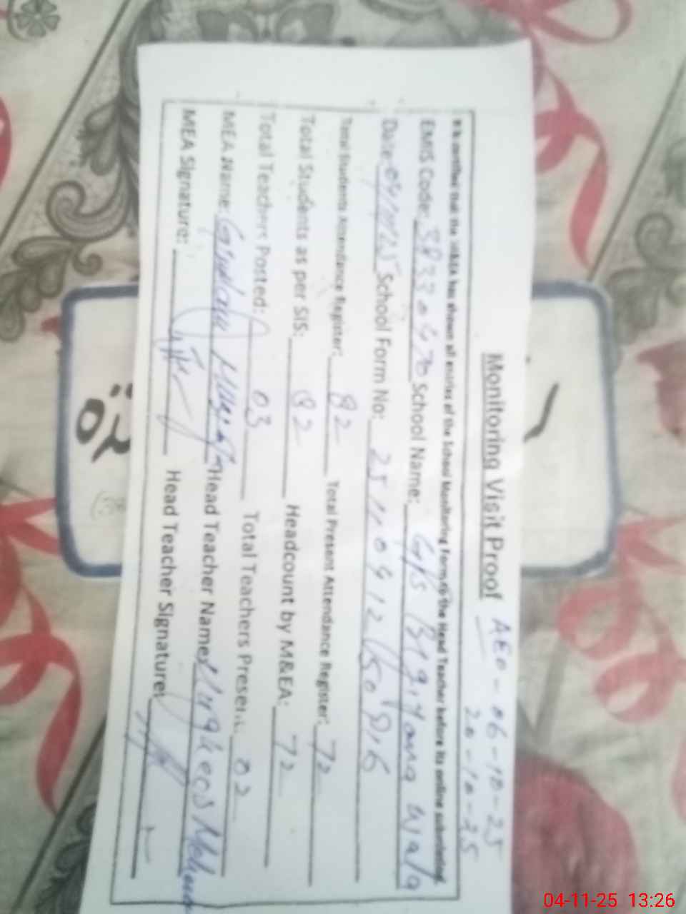| Attendance Register | Head Teacher | MEA with School | Visit Proof |