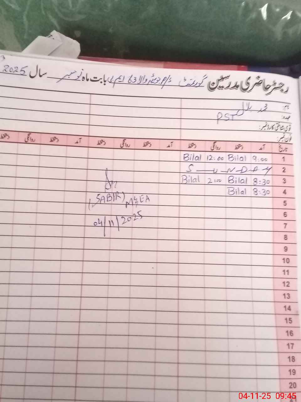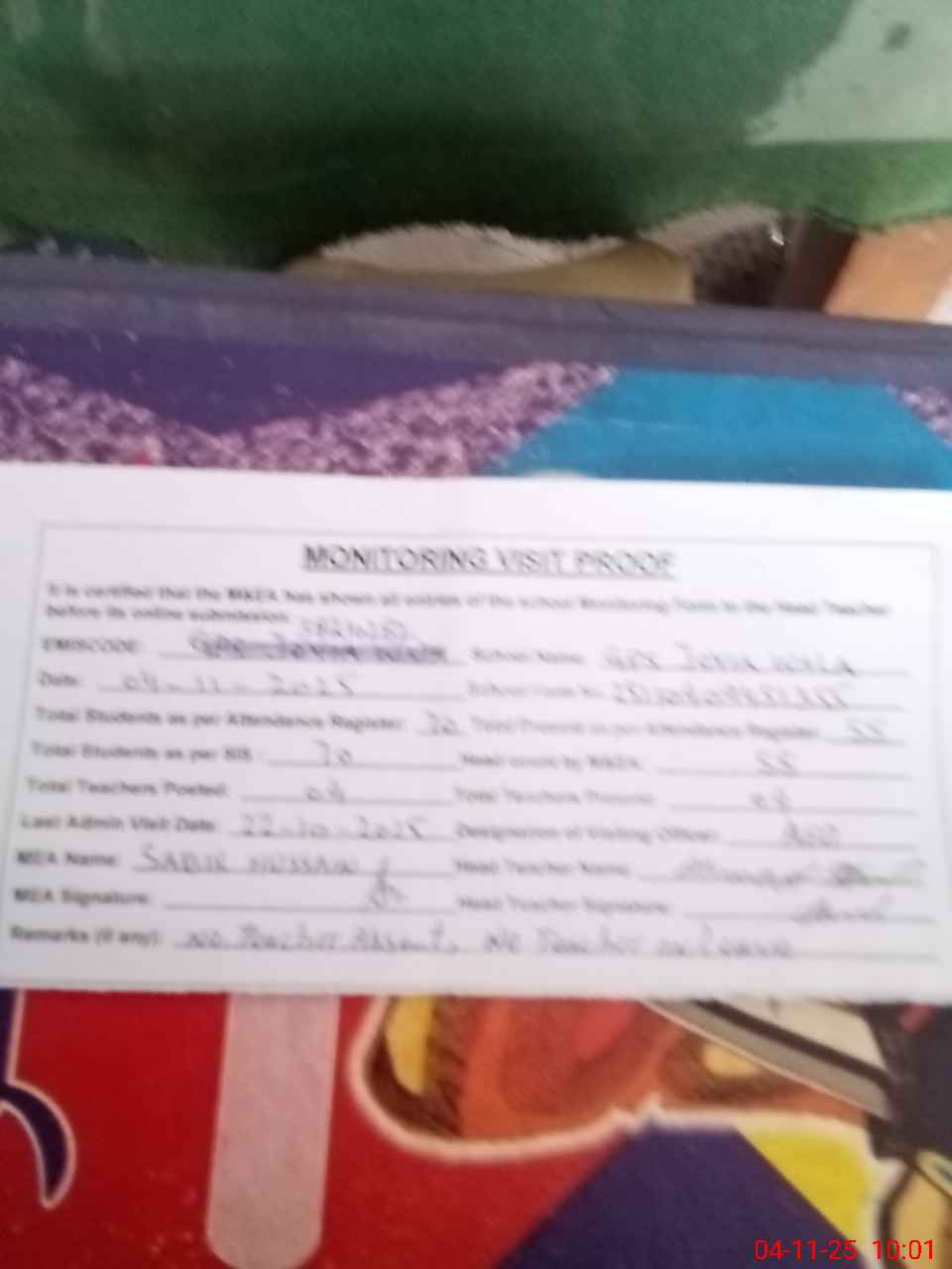| Remarks (Use Separate Page if Required): No teacher absent No teacher on leave all 04 teachers are present Last admin visit by AEO on 22 Oct 2025 | |||||