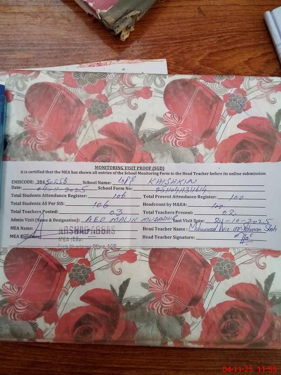 | EMIS Code: 38450258 | Name of School: GPS KHISHKAN | |||