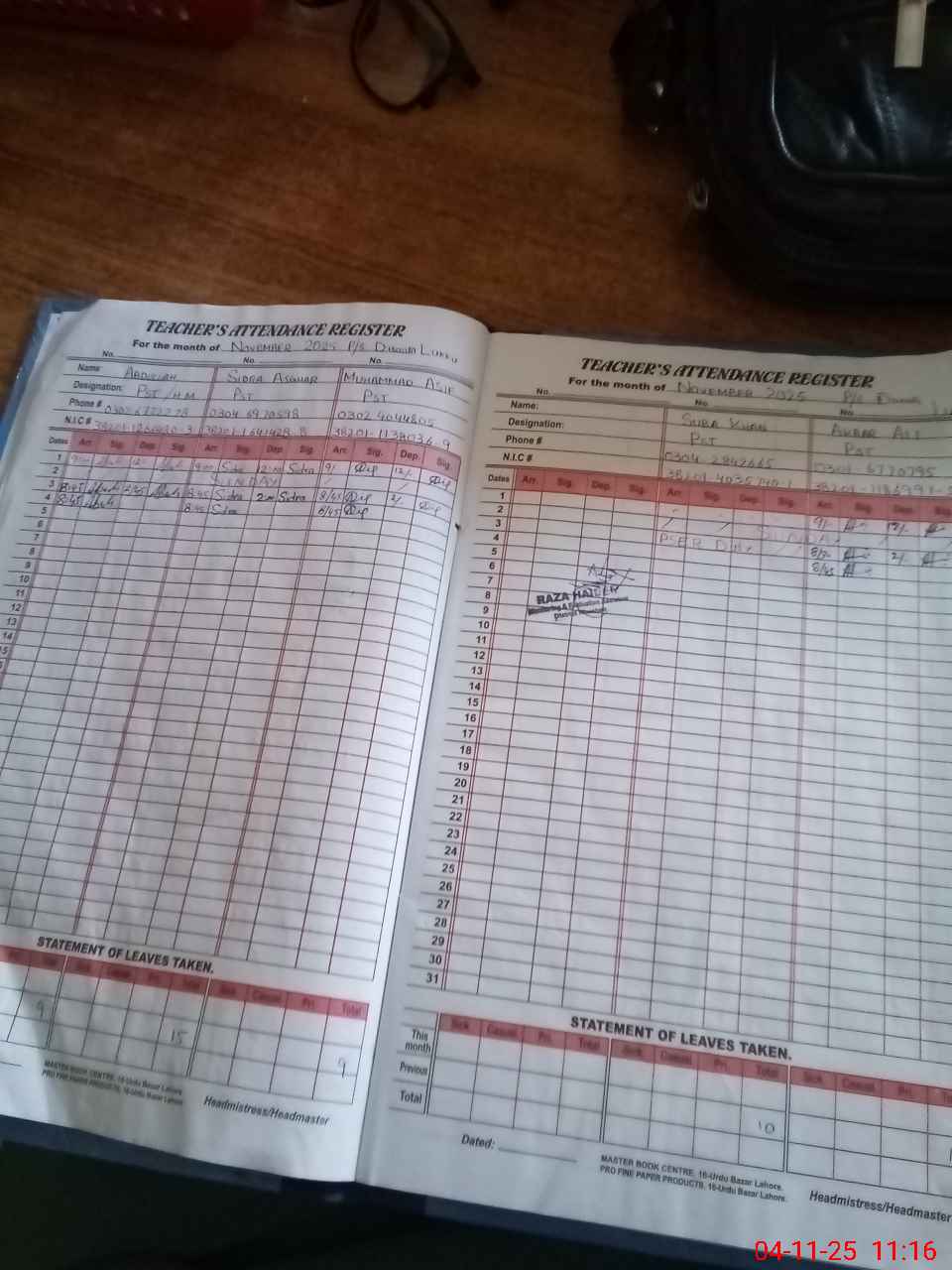 | CNIC | Full Name | Designation | R/C | Absence During Last Calender Month |
