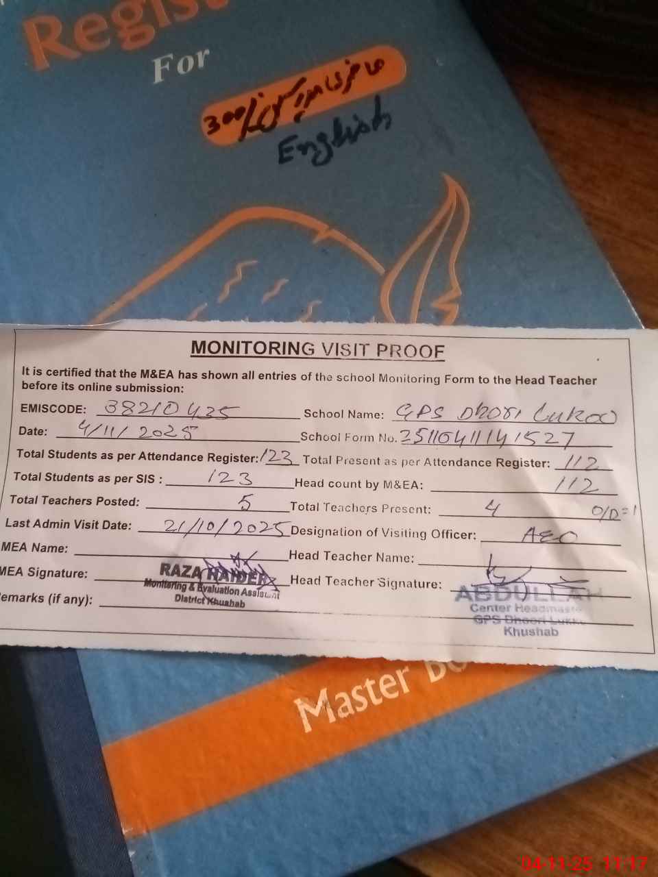 | Attendance Register | Head Teacher | MEA with School | Visit Proof |