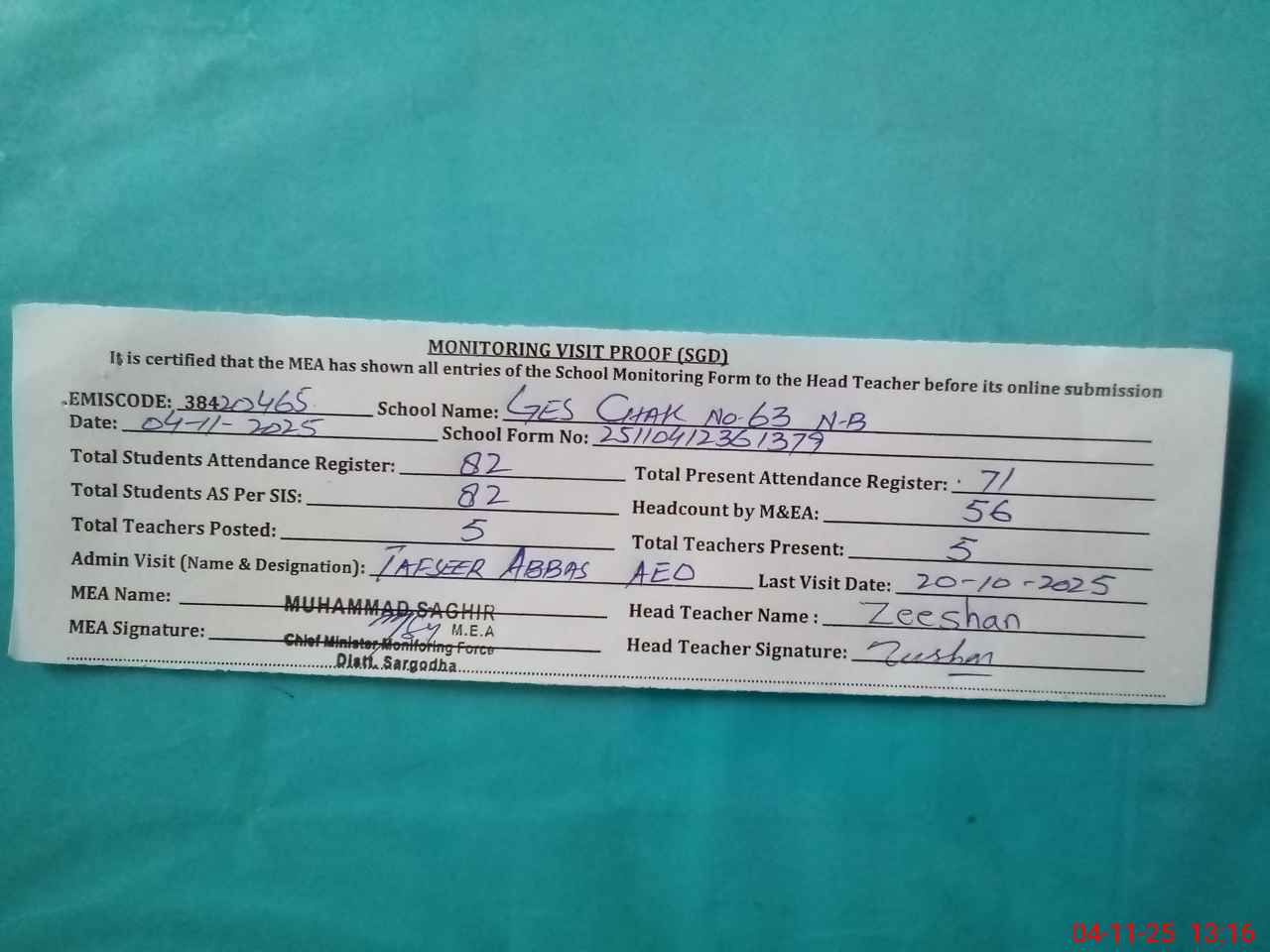 | EMIS Code: 38420465 | Name of School: GES CHAK NO.63 NB | |||