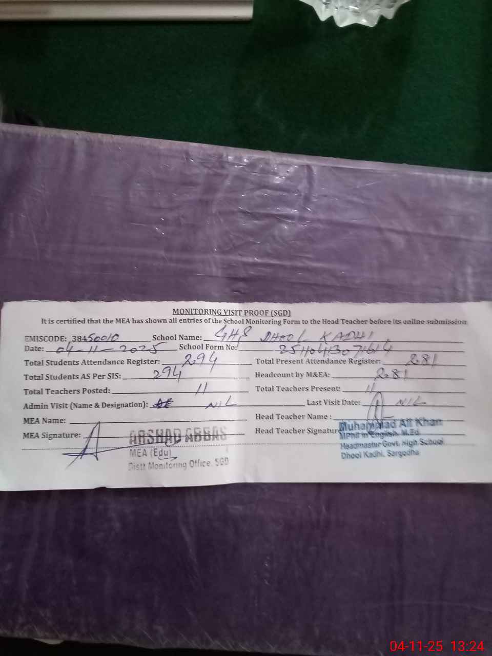 | Attendance Register | Head Teacher | MEA with School | Visit Proof |