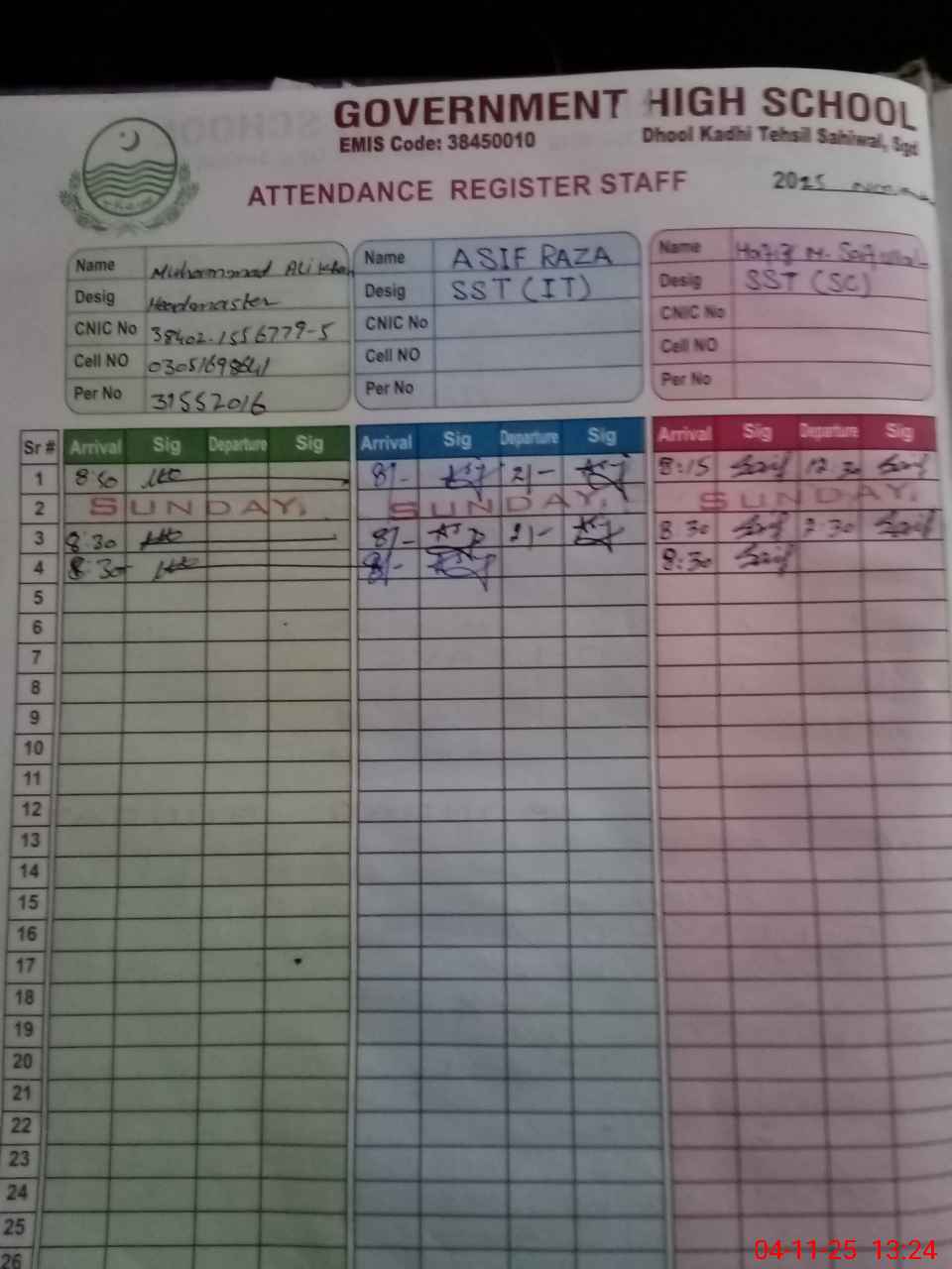 | CNIC | Full Name | Designation | R/C | Absence during last cal. month |