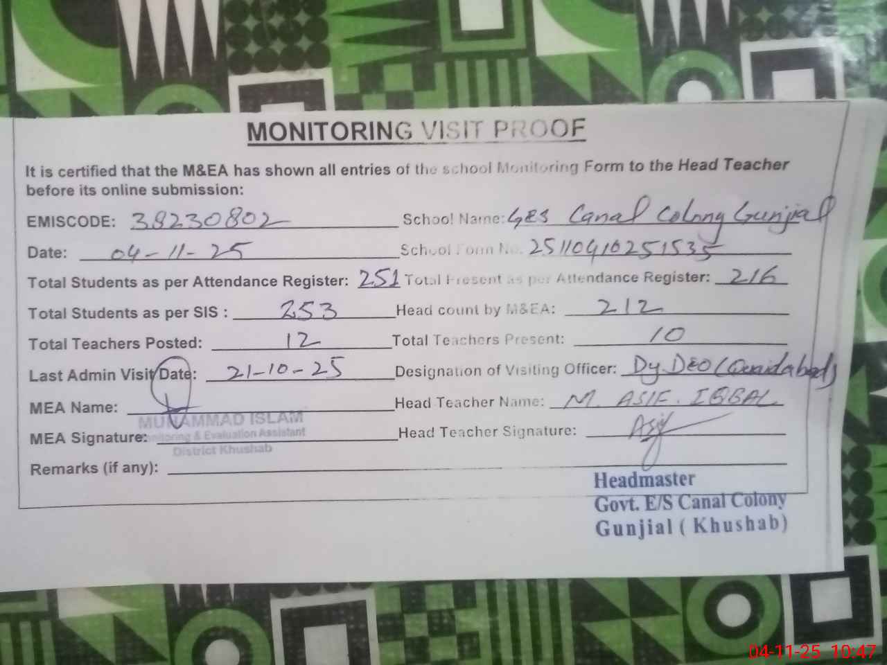 | Remarks (Use Separate Page if Required): Deputy DEO visited school on 21Oct 2025 | |||||