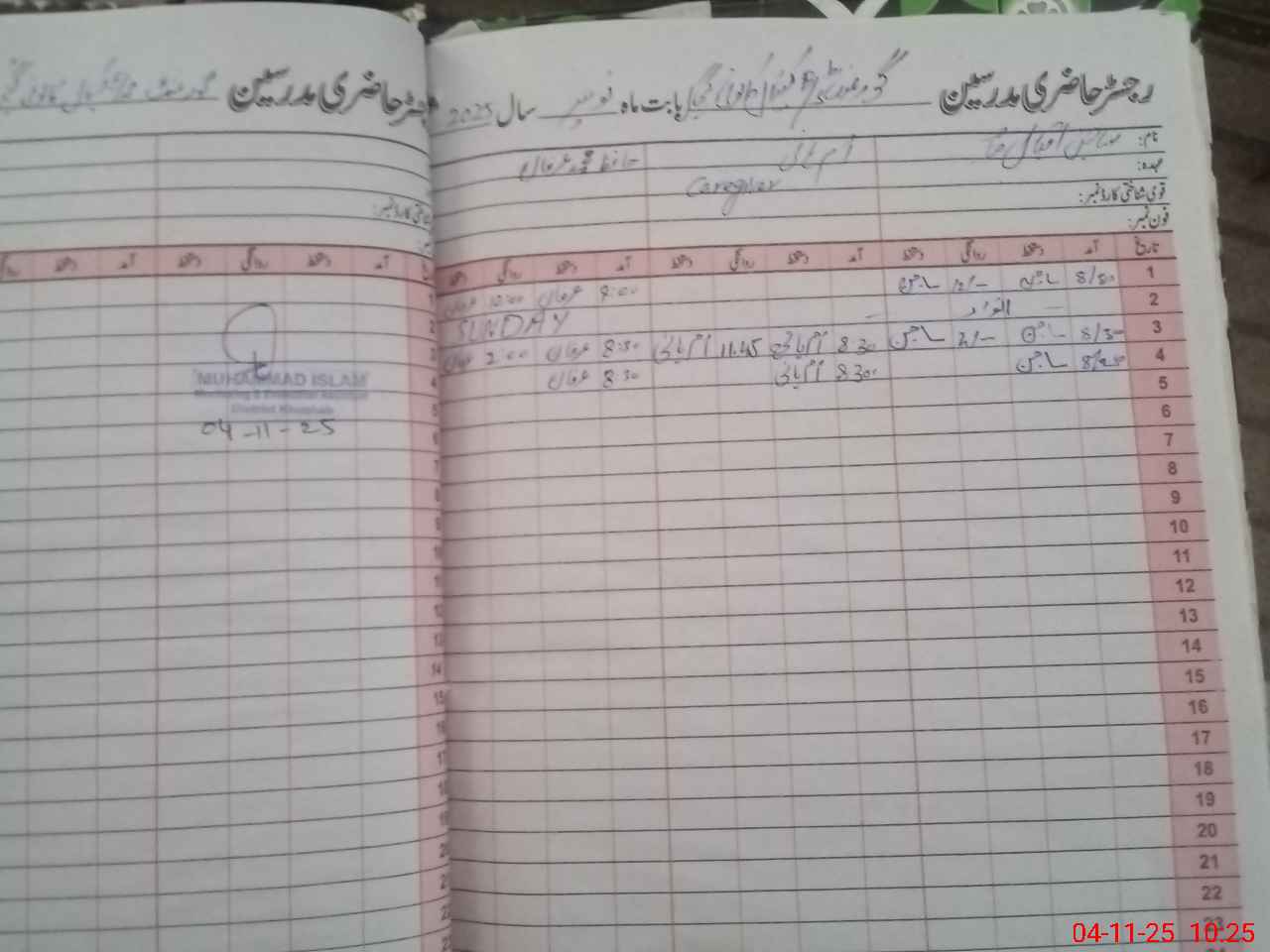 | CNIC | Full Name | Designation | R/C | Absence During Last Calender Month |