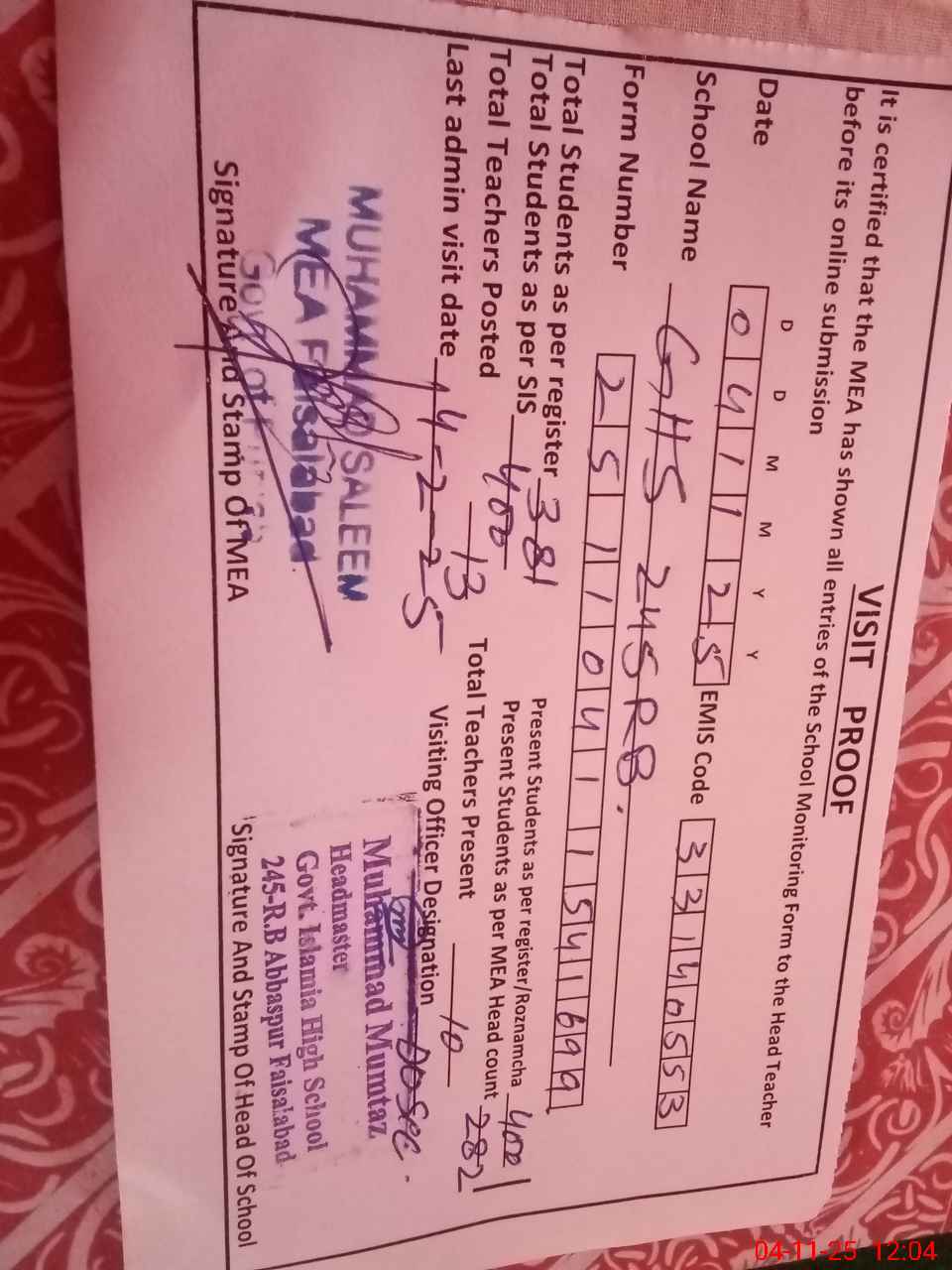 | EMIS Code: 33140553 | Name of School: GHS ISLAMIA CHAK NO 245 RB ABBAS PUR | |||