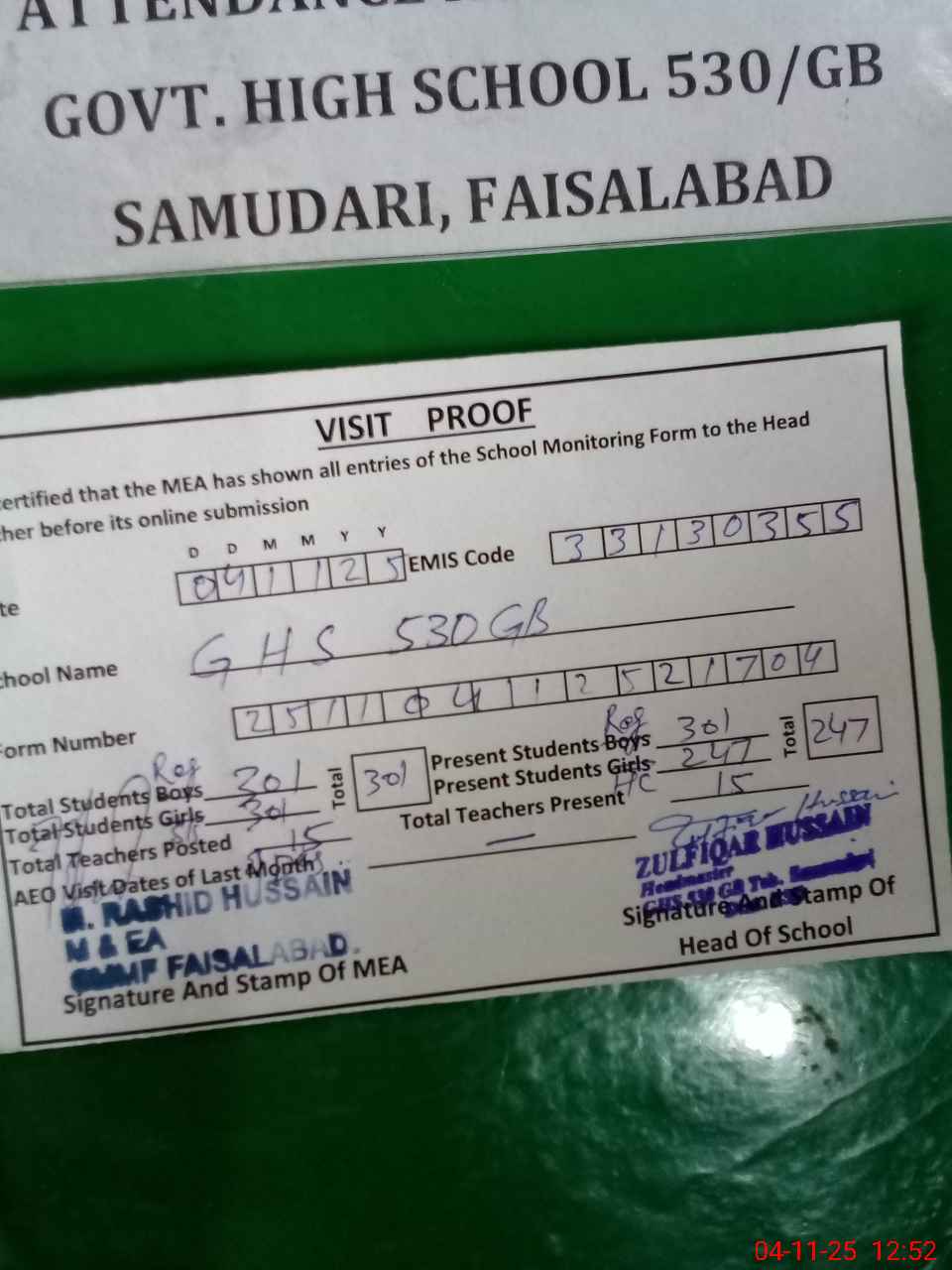 | EMIS Code: 33130355 | Name of School: GHS CHAK NO. 530/GB FSD | |||