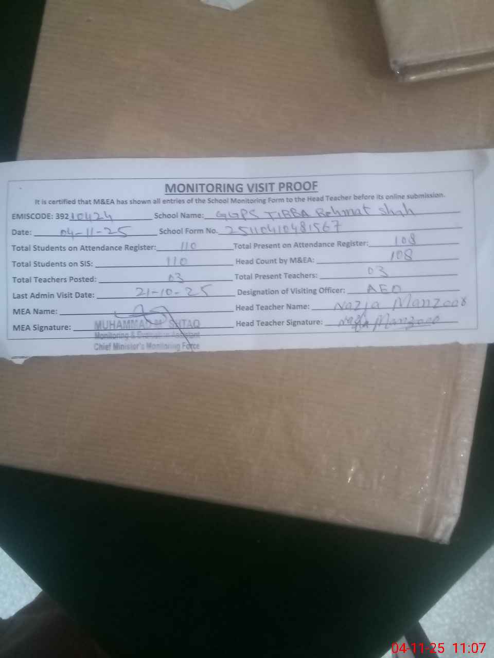 | Attendance Register | Head Teacher | MEA with School | Visit Proof |
