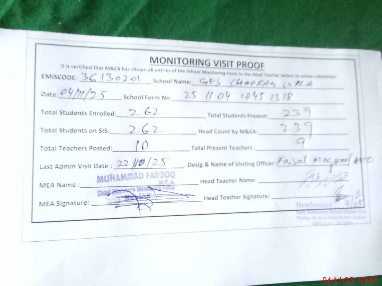 | EMIS Code: 36130201 | Name of School: GES CHPRAN WALA MOZA CHAPRAN WALA P/O TATAY PUR | |||