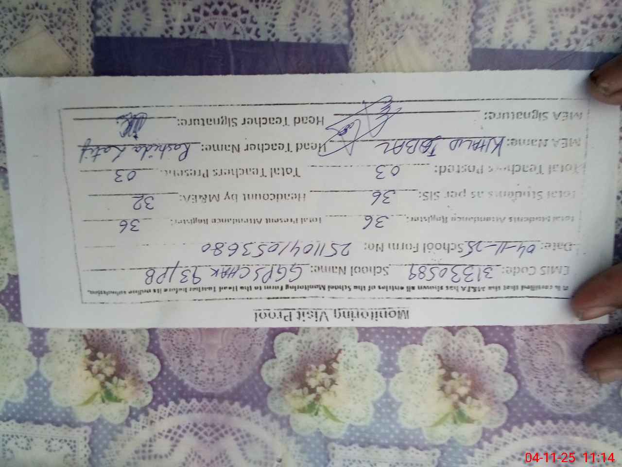 | Attendance Register | Head Teacher | MEA with School | Visit Proof |