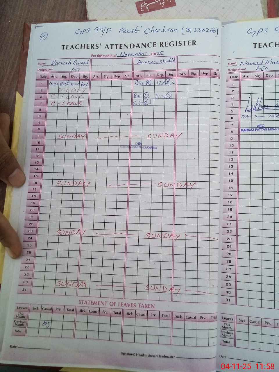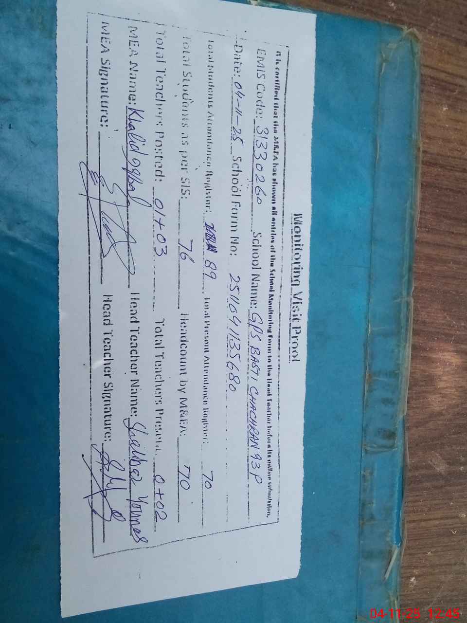 | Attendance Register | Head Teacher | MEA with School | Visit Proof |